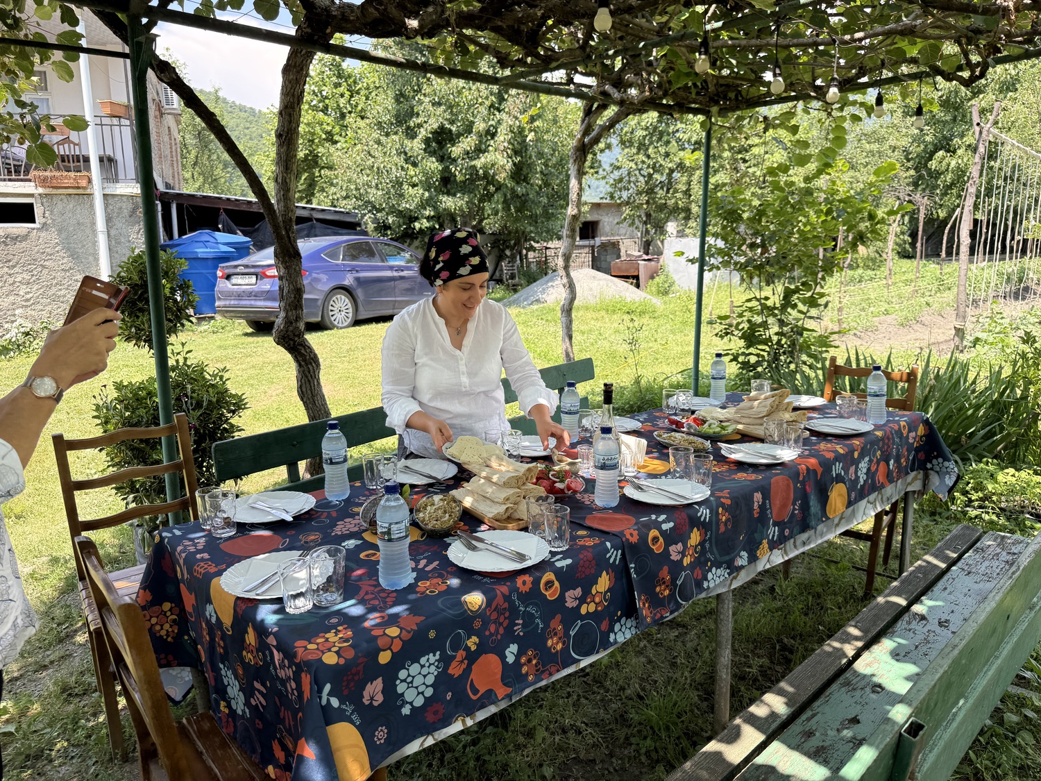 Veriko, a professional violinist and a mother of four. Veriko runs her household alongside her family, taking care of the vineyard, gardens, harvesting bio vegetables and fruits, baking bread, making Churchkhela, and much more. Her goal is to have bio products for her kids and the guests. Despite her busy schedule, she manages to host us for lunch, preparing a beautiful Sufra (traditional feast) and showing exceptional hospitality.